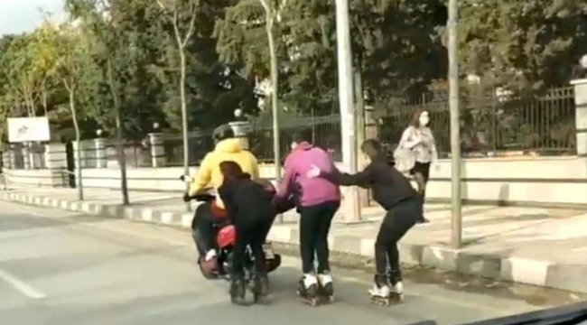 Manisa'da 6 patenli gencin iki ayrı motosiklete tutunarak yoğun trafik içinde seyretmesi tepkiye neden oldu. O anlar bir sürücü tarafından kaydedilirken patenli gençlerin rahat tavırları dikkat çekti. Manisa'nın Yunusemre ilçesi İzmir Caddesinde Cuma günü çekilen görüntülerde arka arkaya seyreden iki ayrı motosikletin birinde 2, diğerinde 4 patenli hem motosiklete hem de birbirlerine tutunarak yoğun trafik içinde yolculuk etti. Gençler hem kendi canlarını hem de trafiği tehlikeye düşürdü. O anlar bir araç içinden cep telefonuyla kaydedilirken gençlerin rahat tavırları ve birbirlerine tutunarak yoğun trafik içinde ölümüne yolculukları görenlere pes dedirtti.