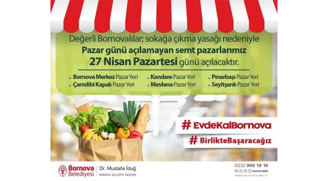 Bornova’da sokağa çıkma yasağı nedeniyle Pazar günü hizmet veremeyen tüm pazaryerleri Pazartesi günü açılacak. Bornova Belediyesi tarafından yapılan düzenlemeye göre; Bornova Merkez, Çamdibi, Mevlana, Pınarbaşı, Kandere , Atatürk Mahallesi Şehit Kara Pilot Mehmet İlker Karaman Pazaryerleri Pazartesi günü kurulacak.