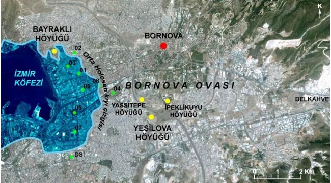 Bornova Ovasının alüvyal jeomorfolojisi ve paleocoğrafya özelliklerinin belirlenmesi amacıyla, Ege Üniversitesi Edebiyat Fakültesi Fiziki Coğrafya Anabilim Dalı öğretim üyelerinden oluşan ekipler tarafından 1996 yılından beri delgi sondaj yöntemli araştırmaların bu alanda sürdüğünü vurgulayan Dr. Öğretim Üyesi Aylin Karadaş ise “Bu konuda bir doktora tezi ve bir lisans tezi hazırlanmış, çok sayıda makale ve bildirilerimiz yayınlanmıştır. Bu amaçla ovada DSİ tarafından yapılmış çoğunluğu 100 metreden fazla ve 300 metrelere ulaşan derinliklerdeki 154 sondaj verisi değerlendirilmiştir. Bunun yanında yine derinliği 20 metrelere ulaşan, Bayraklı Höyüğü çevresinde 21, Yeşilova Höyüğü çevresinde 30 ve ova gelinde 10 olmak üzere ekibimizce de toplam 61 delgi sondaj yapılmıştır. Sayısı az olsa da Karbon 14 tarihlemeleri yaptırılmıştır. Delgi sondajlardan alınan alüvyon örneklerinin sedimantolojik, paleontolojik ve palinolojik analizleri Ege Üniversitesi Edebiyat Fakültesi bünyesindeki Alüvyal Jeomorfoloji laboratuvarında yapılmaktadır. Bornova Ovasında günümüzden 6000 yıl önce Orta Holosen’de sondaj sonuçlarımıza göre kıyı çizgisinin bugünküne oranla 2 km kadar içeriye sokulduğu ortaya konmuştur” diye konuştu.