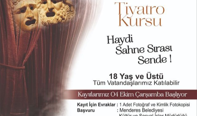 Menderes Belediyesi tarafından sürdürülen kültür sanat etkinlikleri kapsamında ‘’Haydi sahne sırası sende’’ sloganıyla tiyatro kursu gerçekleştirilecek. Ücretsiz olarak düzenlenecek kursa katılmak isteyen vatandaşlar için başvurular alınmaya başlandı.