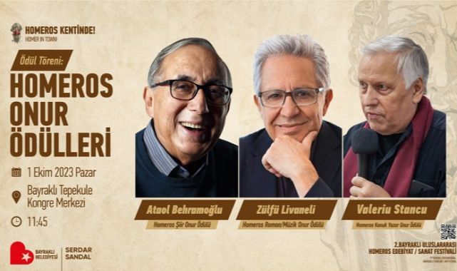 Bayraklı Belediyesi tarafından bu yıl ikinci kez düzenlenen Bayraklı Uluslararası Homeros Edebiyat/Sanat Festivali’nin programı belli oldu. 29-30 Eylül, 1 Ekim tarihlerinde gerçekleşecek festival, birbirinden değerli yerli ve yabancı sanatçıları İzmirli sanatseverlerle buluşturacak. Festival kapsamında Zülfü Livaneli’ye Homeros Roman/Müzik Onur Ödülü, Ataol Behramoğlu’na Homeros Şiir Onur Ödülü ve Valeriu Stancu’ya Konuk Yazar Onur Ödülü verilecek. Başkan Serdar Sandal “Bayraklı’yı uluslararası boyuta taşıyan ve edebiyat- sanat şölenine herkesi bekliyoruz” dedi.