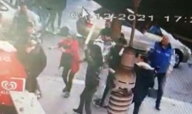 “Kadın ayırırken arada kaldı, yaralanmaktan son anda kurtuldu”Öte yandan olay bir iş yerinin güvenlik kamerası tarafından kaydedildi. Kavgayı gören bir kadın kavgayı ayırmaya çalışırken arada kaldığı ve yaralanmaktan son anda kurtulduğu görülüyor."Oturuyorduk birden arada kaldık"Olayla ilgili konuşan Hüseyin Haketis isimli vatandaş, “Cuma günü kavga oldu. Burada çalışan iki tane yabancı uyruklu eleman önceden tartışıyordu. Biz de burada oturuyorduk. Bir anda tartışma çıktı. Tartışmanın arasına girdiğimizde birbirlerine satırlarla saldırmaya başladılar, adam yerde yatmaya başladı. Kafadan, boynundan ve kolundan kesikler oluştu, satırla kestiler. 4-5 kişi aynı anda bir kişiye saldırınca, birbirlerinin kafalarını yaraladılar. Yerde yatıyordu, ambulans geldi adamı götürdüler. Duyduğumuza göre durumu iyi ama tanımıyoruz. İnşallah önemli bir şeyi yoktur” diye belirtti.
