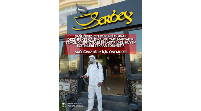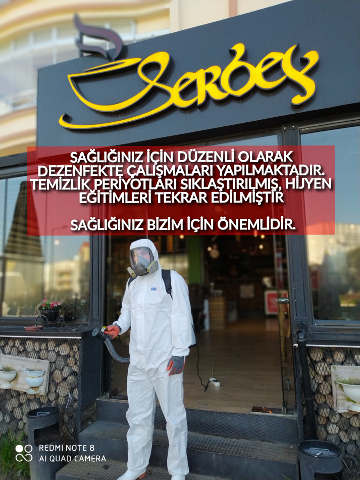 Dünyayı etkisi altına alan ve ülkemizde de görülen yeni tip koronavirüs salgınına karşı SERBEY KAFE’ de tedbirlerini almaya devam ediyor.Rutin temizlik çalışmalarının periyotları sıklaştırılarak, masa, sandalye, kapı kolları, lavabolar gibi sık kullanılan yüzeyler gün içinde sürekli olarak klorak ile temizlenmektedir. Ürün servislerinde tek kullanımlık malzemeler müşterilerin tercihine sunulmuştur.Bir talimat beklemeden dezenfektre çalışmaları yapan SERBEY KAFE sorumluları “misafirlerimizin sağlığı bizim için önemli o yüzden hijyen tedbirlerine her zaman fazlasıyla dikkat ediyoruz. Personelin hijyen eğitimleri de tekrarlanarak gerekli tedbirler alınmıştır. Misafirlerimiz gönül rahatlığıyla kafemize gelip, keyiflerince zaman geçirebilirler. Bizler gereken her türlü önlemi almış bulunuyoruz”