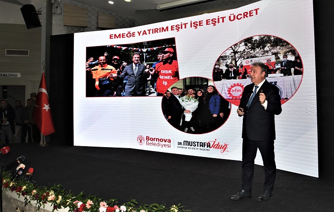 Bornova Belediyesi’nin ödüllü projesi Altın Bilezik aracılığıyla 21 bin kişiyi işe yönlendirdiklerini söyleyen Başkan İduğ, “112 firmanın katıldığı istihdam fuarını düzenleyerek insanlarımızın geçim dertlerine derman olduk. Kadınlarımızın evden çalışarak aylık 8-10 bin lira düzeyinde ek gelir sağlayabilecekleri ‘2 Oda 1 İş’ projemizle onlara nefes olduk. Terbay Meslek Lisesi projemizle gençlerimizi hem meslek hem iş kazandırmaya devam ediyoruz” diye konuştu.