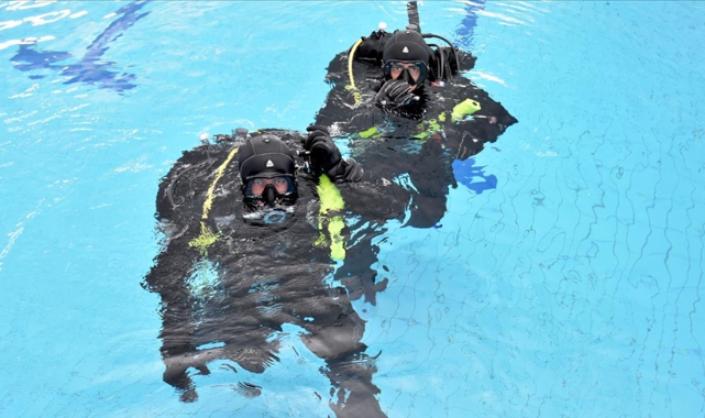 Erzurum İl Afet ve Acil Durum Müdürlüğü bünyesindeki bir havuzda dalış ve arama kurtarma eğitimi yapan SAK timleri, senaryo gereği öldürülerek suya atılan bir kişinin bulunmasına yönelik tatbikat yaptı.