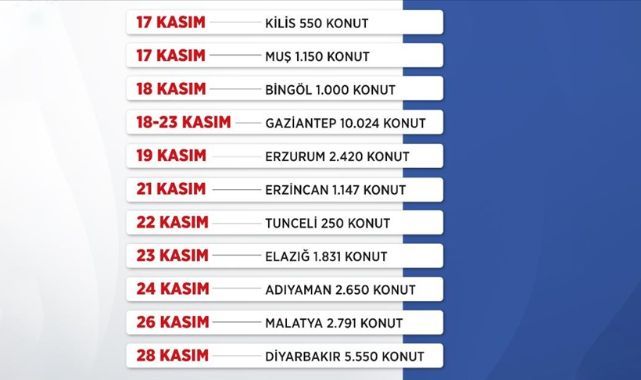 11 ilin kura çekimi için yeni takvim belli oldu. Çevre, Şehircilik ve İklim Değişikliği Bakanlığı, Kilis, Muş, Bingöl, Gaziantep, Erzurum, Erzincan, Tunceli, Elazığ, Adıyaman, Malatya, Diyarbakır illeri için gerçekleşecek kura tarihlerini paylaştı.Kura çekimi bugün Kilis ve Muş ilerinde başlayacak. 17-28 Kasım tarihleri arasında gerçekleşecek konut kuralarının çekilişinde Kilis, Muş, Bingöl, Gaziantep, Erzurum, Erzincan, Tunceli, Elazığ, Adıyaman, Malatya, Diyarbakır’da toplam 29 bin 363 konut sahiplerini bulacak.