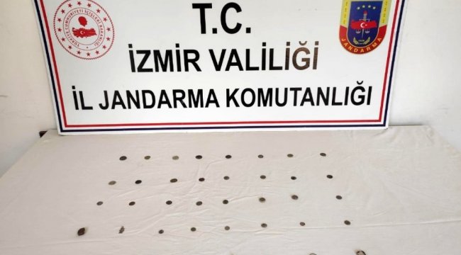 İzmir'in Selçuk ilçesinde düzenlenen operasyonda tarihi eser niteliğinde değerlendirilen 38 adet madeni para ve obje ele geçirildi. Olayla ilgili 1 kişi gözaltına alındı. Edinilen bilgiye göre, İzmir İl jandarma Komutanlığı ekipleri, kaçakçılık olaylarının engellemesine yönelik yaptığı çalışmalarda, Aydın'ın Kuşadası ilçesinde ikamet eden O.Y. isimli şahsın, tarihi eser niteliği taşıdığı değerlendirilen madeni paraları satmak amacıyla Selçuk'a getireceği bilgisine ulaştı. Ekipler, Selçuk Cumhuriyet Başsavcılığından alınan talimatlar doğrultusunda O.Y. isimli sahsı yakaladı. Yapılan aramada tarihi eser olarak değerlendirilen 38 adet madeni para ve obje ele geçirildi. Olayla ilgili gözaltına alınan şüpheli O.Y.'nin ifadesinin alınmasının ardından serbest bırakıldığı öğrenildi. - İZMİR :