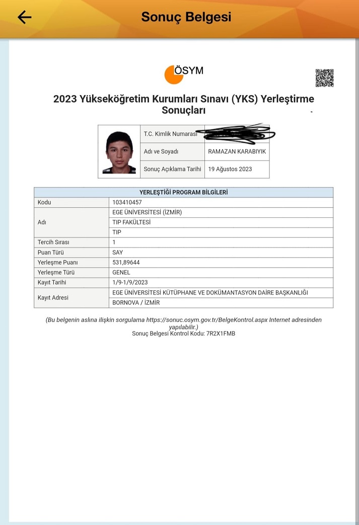 Üniversite sınavlarında Türkiye YKS sayısal alanda 3416 olduğunu hatırlatan Karabıyık, Ege Üniversitesi Tıp Fakültesi’ni kazandığını, Kardiyalog olup milletimize hizmet etmek istediğini sözlerine ekledi. Emine-Sadettin Karabıyık çifti de çocukları ile gurur duyduklarını ifade ettiler.
