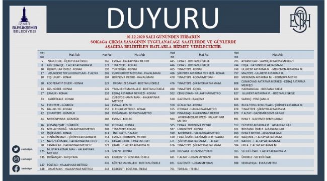 Metro, Tramvay, İZDENİZ ve İZBAN seferleriyle uyumlu olacak şekilde planlanan sefer programı, ESHOT’un resmi internet sitesinde ve akıllı telefonlara indirilebilen ESHOT Mobil uygulamasında görülebilir. İzmir metro A.Ş. ile Konak ve Karşıyaka tramvay hatlarında cumartesi ve pazar günleri 06.00-00.20 saatleri arasında 30 dakikada bir sefer yapılıyor. İZDENİZ ve İZBAN sefer tarifelerine de her iki kuruluşun resmi internet sitelerinden ulaşılabilir.
