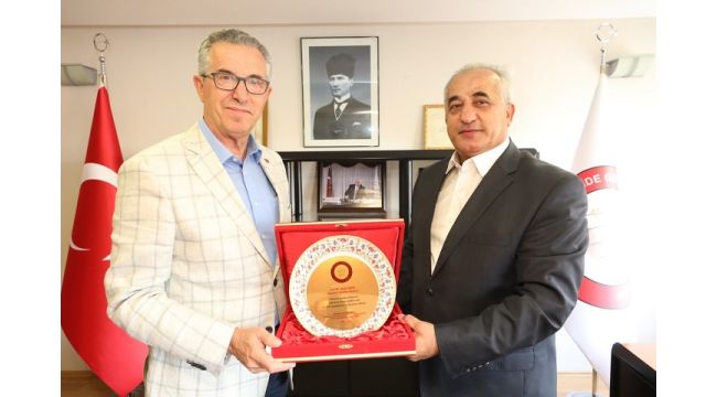 Ziyaretini sonunda günün anısına oda başkanı Mehmet Şükrü Erişen, Halil Arda’ya bir teşekkür plaketi sundu.