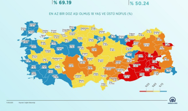 En az bir doz aşı yapılanların oranı en az iller ise Şanlıurfa, Mardin, Bitlis, Muş, Diyarbakır, Gümüşhane, Batman, Bingöl, Siirt ve Iğdır olarak sıralandı.