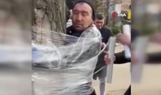 Ukrayna’da halk yakaladıkları Rusya vatandaşını streç filmle ağaca bağladı.