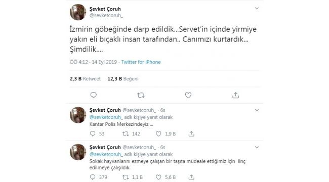 Olayın ardından sosyal medya hesabından paylaşımda bulunun Şevket Çoruh, "İzmir’in göbeğinde darp edildik, yirmiye yakın eli bıçaklı insan tarafından. Canımızı şimdilik kurtardık. Kantar Polis Merkezindeyiz. Sokak hayvanlarını ezmeye çalışan bir taşıta müdahale ettiğimiz için linç edilmeye çalışıldık” ifadelerini kullanarak tepki gösterdi.