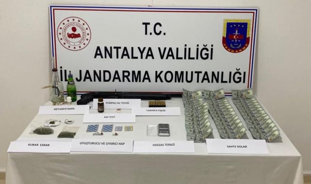 Şahsın ikametinde yapılan aramada uyuşturucu, hassas terazi, uyuşturucu aparatı, ruhsatsız pompalı av tüfeği ve 42 adet sahte 100 dolarlık banknot ele geçirildi.Manavgat İlçe Jandarma Komutanlığına bağlı ekipler tarafından uyuşturucu madde ticareti ile ilgili yapılan çalışmalar neticesinde 12 adet suç kaydı bulunan E.Y. isimli şahsın evinde uyuşturucu madde bulundurduğu, uyuşturucu madde ticareti yaptığı bilgisi alındı.Manavgat Cumhuriyet Başsavcılığı koordinesinde Antalya İl Jandarma Komutanlığı Asayiş Şube Müdürlüğü JASAT Timleri, Manavgat İlçe Jandarma Komutanlığı KOM ve Merkez Karakoluna bağlı ekipler tarafından şüphelinin Bahçelievler Mahallesindeki evinde yapılan aramada; 5 parça halinde toplam 21 gram esrar uyuşturucu maddesi, 100 gram metamfetamin imalatında kullanılan ana etken maddesi saf iyot, 48 adet uyuşturucu/uyarıcı hap, 1 gram metamfetamin uyuşturucu maddesi, 1 adet uyuşturucu satışında kullanılan hassas terazi, 13 adet uyuşturucu satışında kullanılacak boş ambalaj, 4 adet uyuşturucu madde kullanma aparatı payp, 42 adet sahte 100 dolarlık banknot, 50 adet 9 milimetre tabanca fişeği ve 1 adet ruhsatsız pompalı av tüfeği ele geçirildi.Olay ile ilgili gözaltına alınan ve hakkında uyuşturucu madde imal ve ticareti, uyuşturucu madde kullanmak bulundurmak, parada sahtecilik, ruhsatsız tüfek bulundurmak ve mermi bulundurmak suçlarından adli işlem yapılan E.Y.'nin bugün adliyeye sevk edileceği öğrenildi.