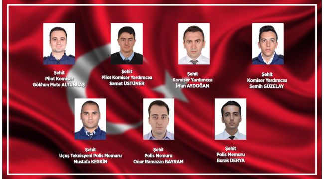 "Pilot komiser Gökhun Mete Altunbaş, pilot komiser yardımcısı Samet Üstüner, komiser yardımcısı İrfan Aydoğan, komiser yardımcısı Semih Güzelay, uçuş teknisyeni polis memuru Mustafa Keskin, polis memuru Onur Ramazan Bayram, polis memuru Burak Derya."