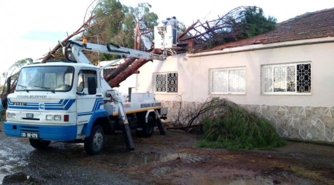 Şiddetli yağış nedeniyle ağaçların ve elektrik direklerinin devrilip çatıların uçtuğu Ayaskent, Zağnos ve Aziziye Mahallelerine giden Bergama Belediye Başkan Yardımcısı Cüneyt Umutlu, incelemelerde bulundu. Dün Saat 15.30 sularında başlayan şiddetli rüzgar ve yağış, Bergama'da en çok Ayaskent, Zağnos ve Aziziye Mahallelerinde etkili oldu. Yola ağaçların devrildiği, elektrik direklerinin yerinden söküldüğü ve çatıların uçtuğu mahallerde belediyenin Fen İşleri Müdürlüğü, Park Bahçeler Müdürlüğü başta olmak üzere tüm ekipler seferber oldu. Projelerle ilgili görüşmelerde bulunmak üzere Ankara'ya giden Bergama Belediye Başkanı Hakan Koştu'nun talimatıyla bir gün öncesinden alınan önlemler neticesinde zarar gören bölgelere anında müdahale edildi. İş makineleri ile yola devrilen ağaçlara müdahale edilmeye başlandı. Olay yerine giden Bergama Belediye Başkan Yardımcısı Cüneyt Umutlu, incelemelerde bulundu. Umutlu, belediyenin imkanları ölçüsünde çalışmaları yapmaya devam edeceğine işaret ederek, tüm vatandaşlara geçmiş olsun dileklerinde bulundu. Umutlu, projelerin takibi için Ankara'da bulunan Başkan Koştu'nun geçmiş olsun dileklerini de vatandaşlara iletti.