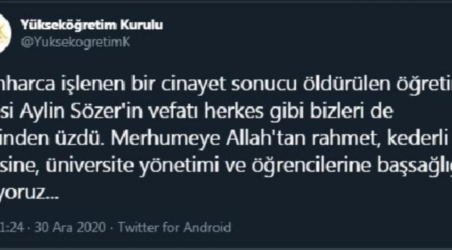 YÜKSEKÖĞRETİM Kurulu (YÖK), İstanbul'da evinde öldürülen akademisyen Aylin Sözer için başsağlığı mesajı yayınladı.YÖK'ün Twitter hesabından yayınlanan başsağlığı mesajında, "Hunharca işlenen bir cinayet sonucu öldürülen öğretim üyesi Aylin Sözer'in vefatı herkes gibi bizleri de derinden üzdü. Merhumeye Allah'tan rahmet, kederli ailesine, üniversite yönetimi ve öğrencilerine başsağlığı diliyoruz" denildi.
