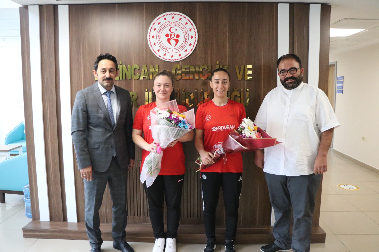 Yonex Bonn Badminton Turnuvası'nda gösterdikleri üstün performansla turnuva şampiyonu olarak Almanya’dan Türkiye’ye dönen Bengisu Erçetin ve Nazlı Can İnci havaalanında Erzincan Gençlik Spor İl Müdürü Volkan Burak Mumcu tarafından karşılandı.