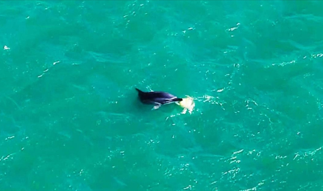 Havadan sahil şeridini görüntüleyen gazeteciler, denizin yüzeyindeki yunusu fark etti.Teknenin şamandırasıyla adeta top gibi oynayan yunus, bir süre sonra gözlerden kayboldu. Yunusun oyunu, drone ile görüntülendi.