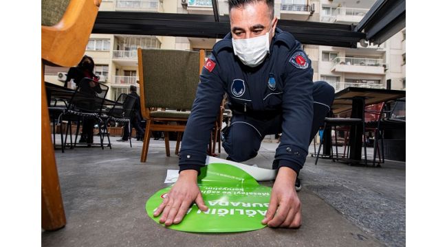 İzmir Büyükşehir Belediyesi Zabıta Dairesi Başkanlığı ekipleri, kontrollü normalleşmenin ardından kentteki denetimlerini daha da sıklaştırdı. Zabıta memurları, sahil bantlarında, kafe, restoran ve alışveriş merkezlerinin bulunduğu bölgelerde sahadaydı. İşletmelere mesafe kuralına uymayı kolaylaştıracak çıkartmalar yapıştırıldı.